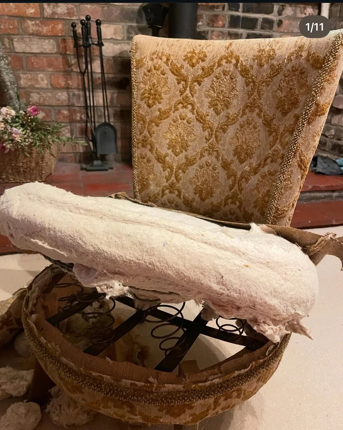 This chair began life as a tired gold tub chair, its structure weakened by rusted springs and years of wear. It was stripped back to the bare frame, repaired and rebuilt from the inside out. New webbing and springs were added, followed by traditional coir hair padding, then further layers of cushioning to restore its form and comfort. The structure was finished with a final layer of Dacron, ready to receive its new skin.